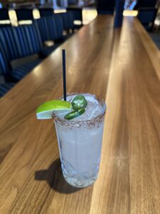 Espolon Blanco Tequila, jalapeno, lime juice, triple sec, agave, Tajin salt rim